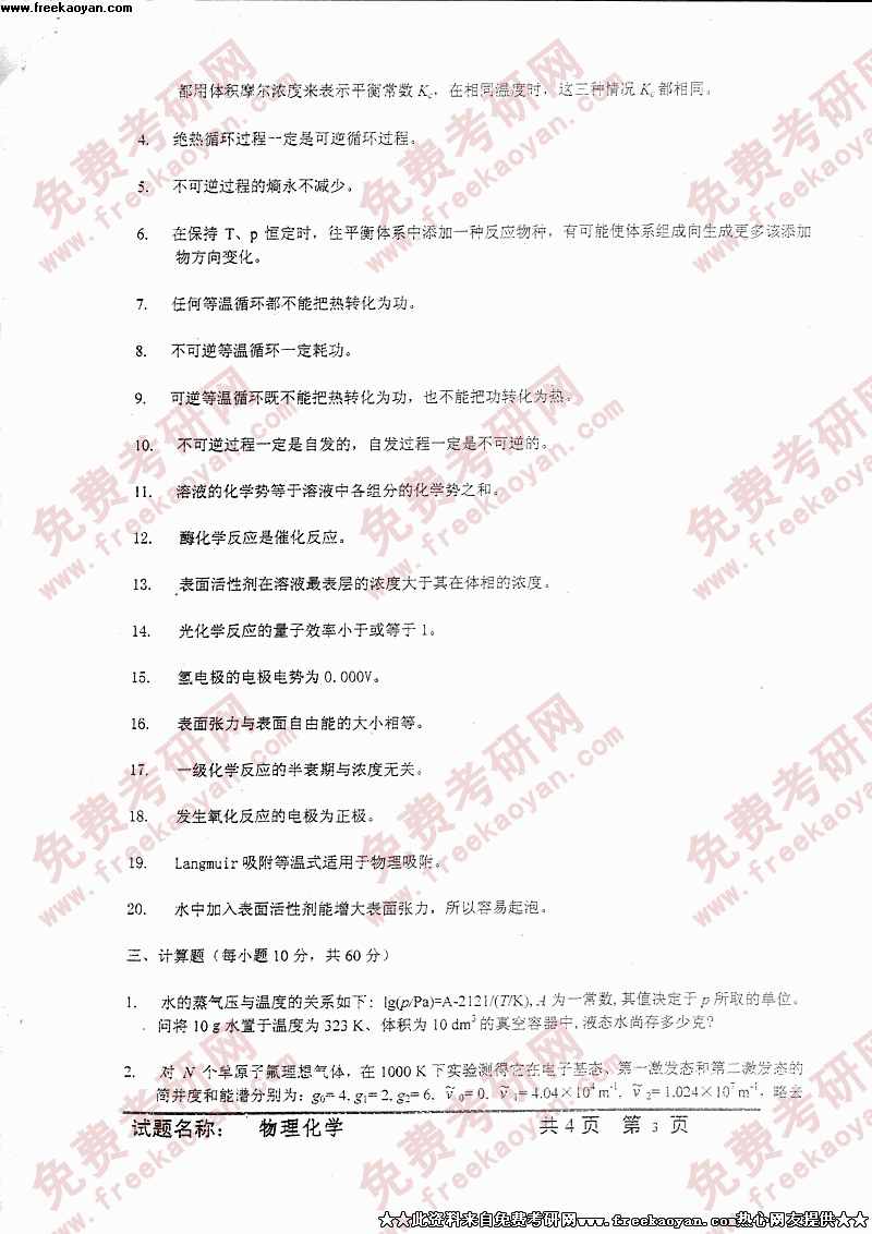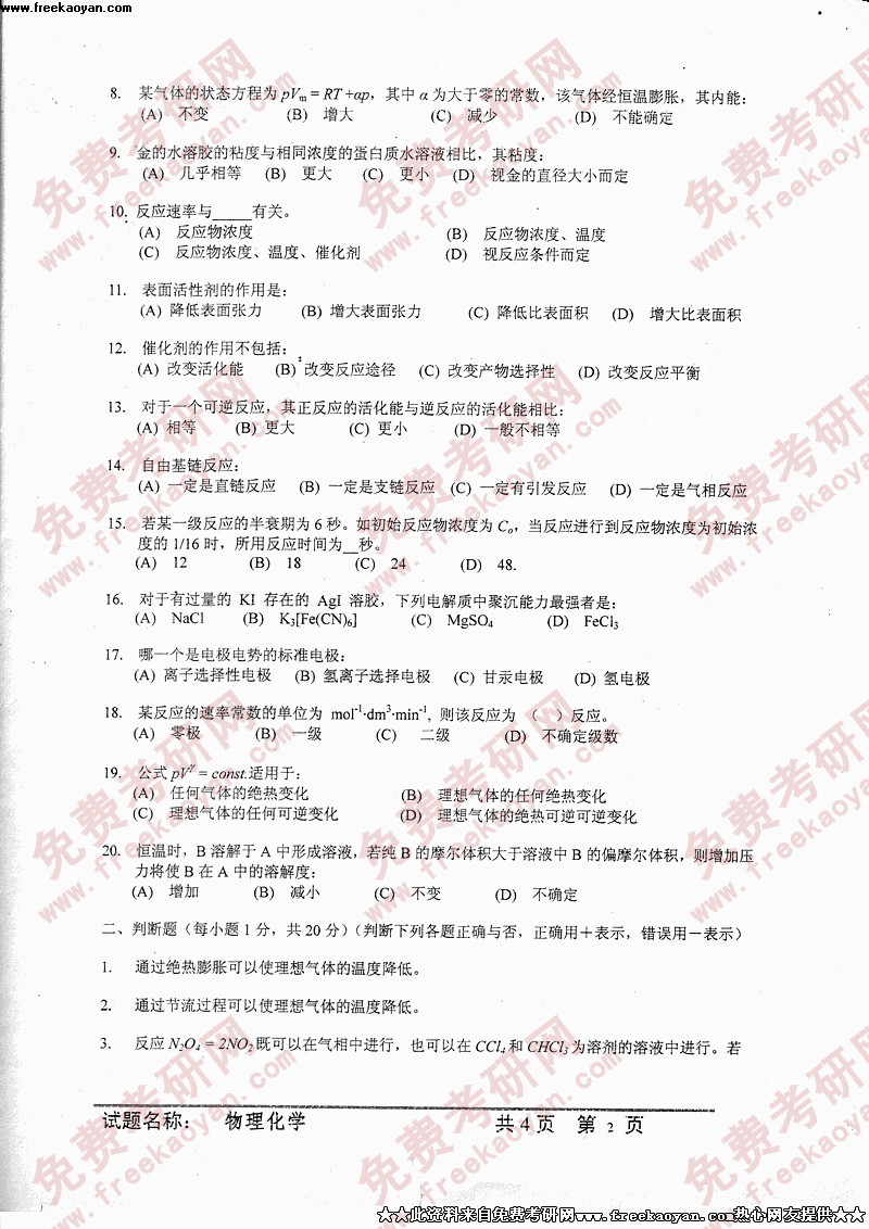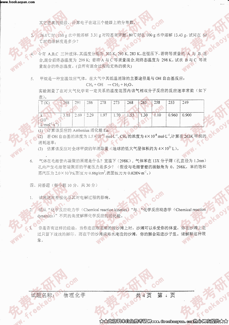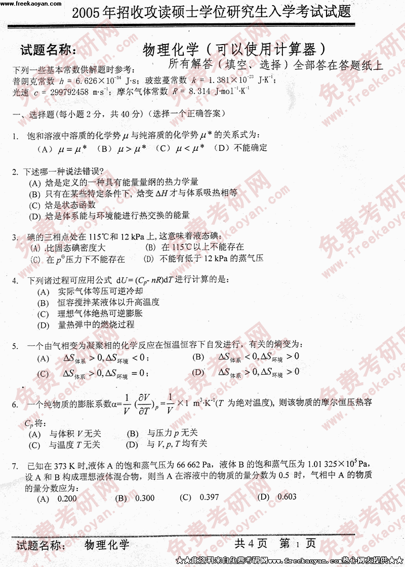 中国科学技术大学2005年硕士研究生入学考试物理化学