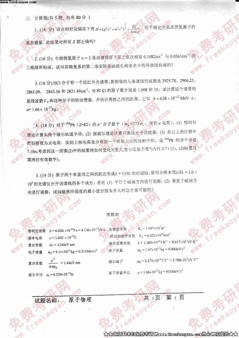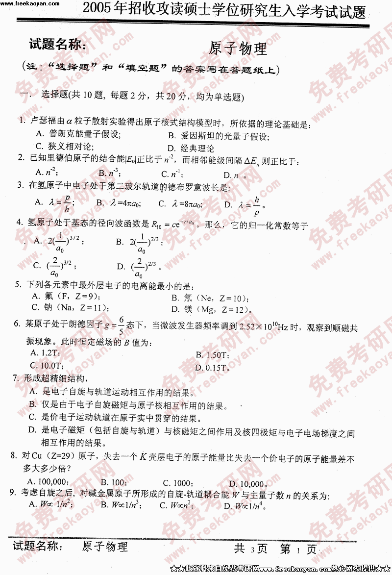中国科学技术大学2005年硕士研究生入学考试原子物理