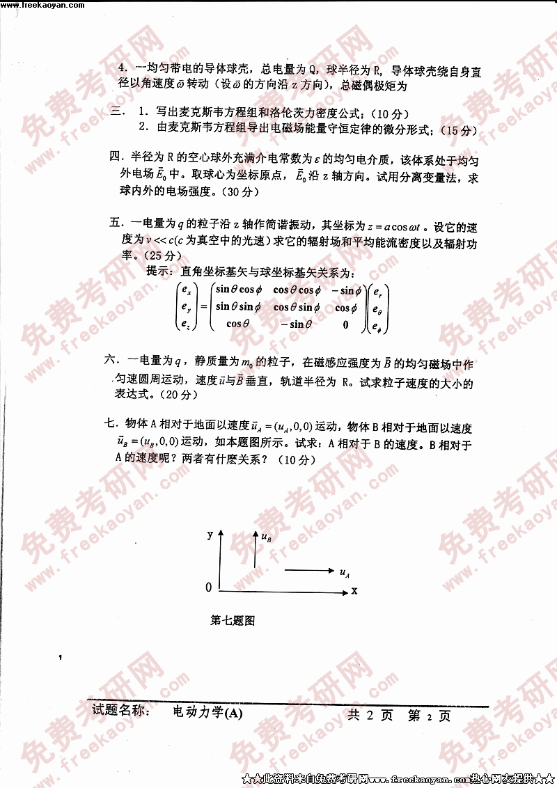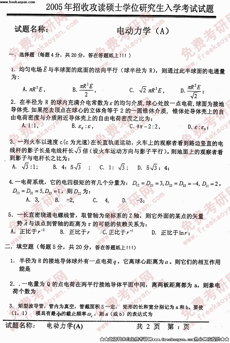 中国科学技术大学2005年硕士研究生入学考试电动力学A