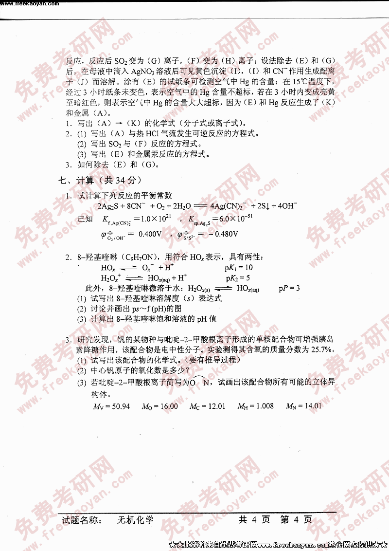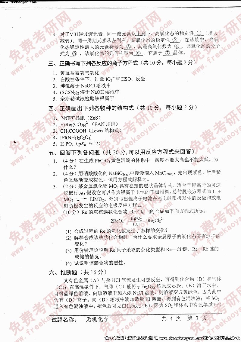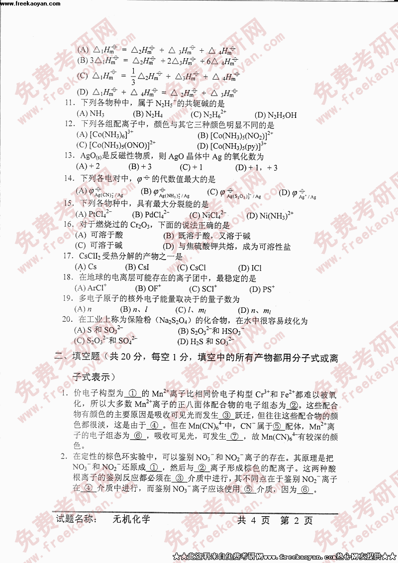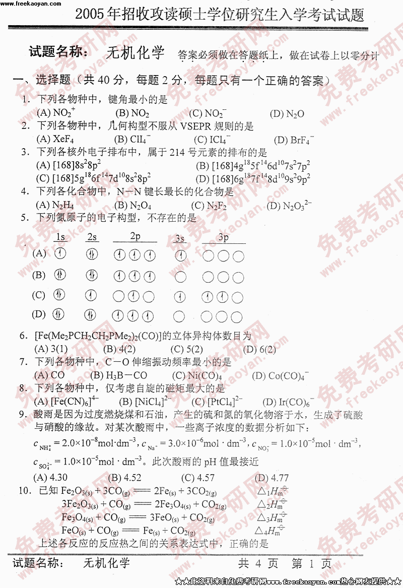 中国科学技术大学2005年硕士研究生入学考试无机化学