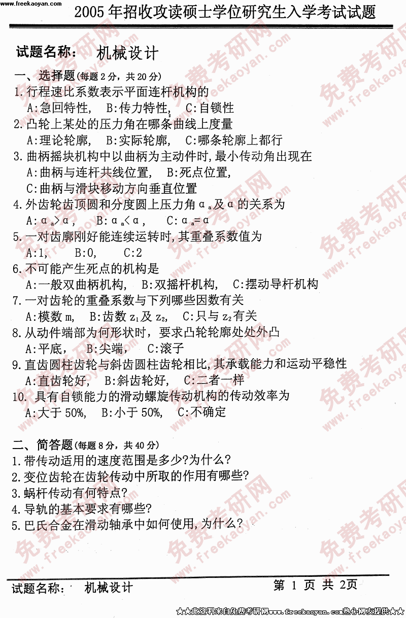 中国科学技术大学2005年硕士研究生入学考试机械设计