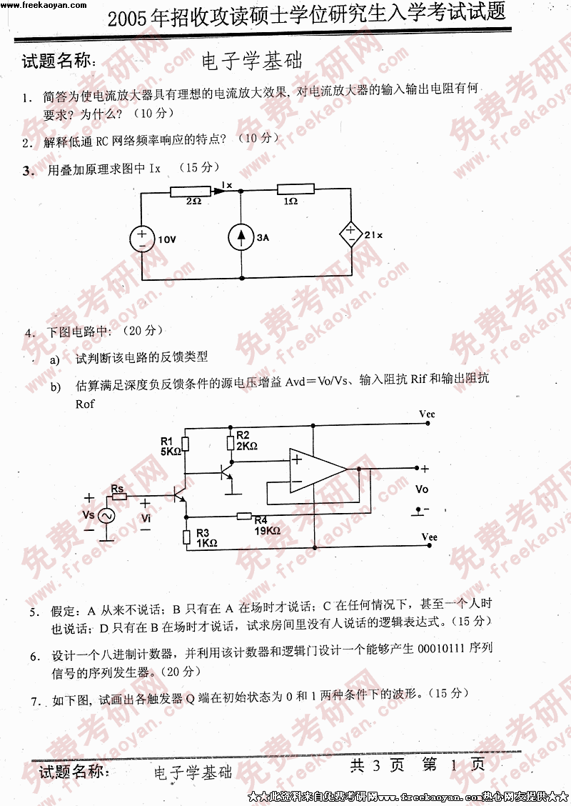 中国科学技术大学2005年硕士研究生入学考试电子学基础