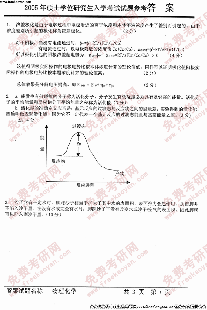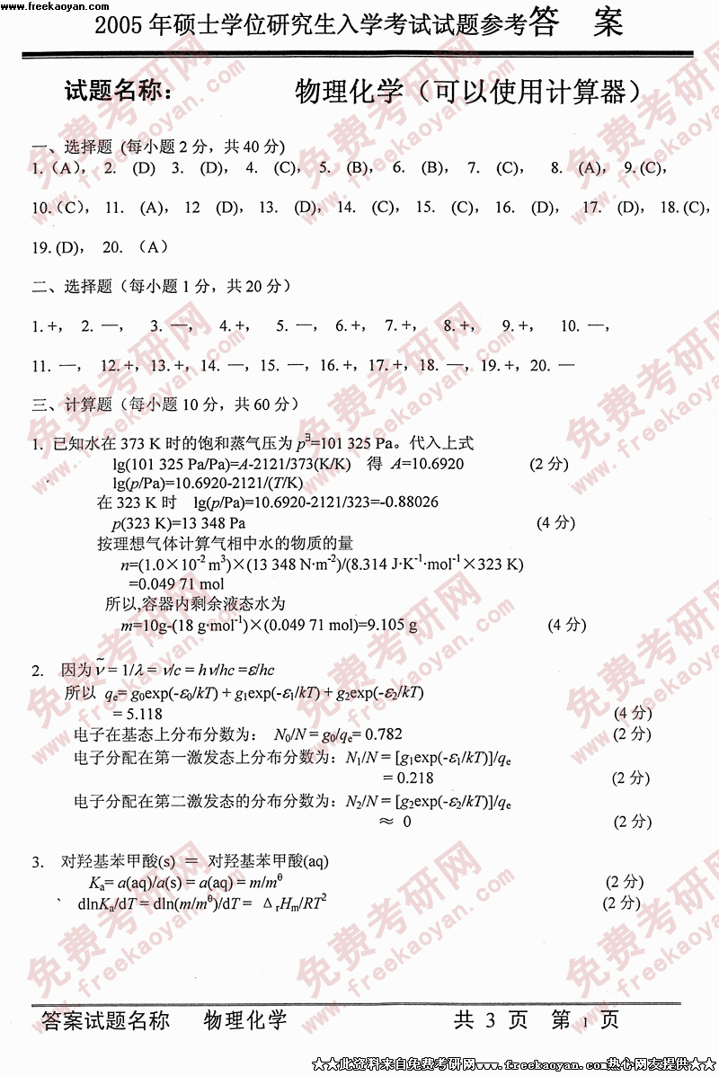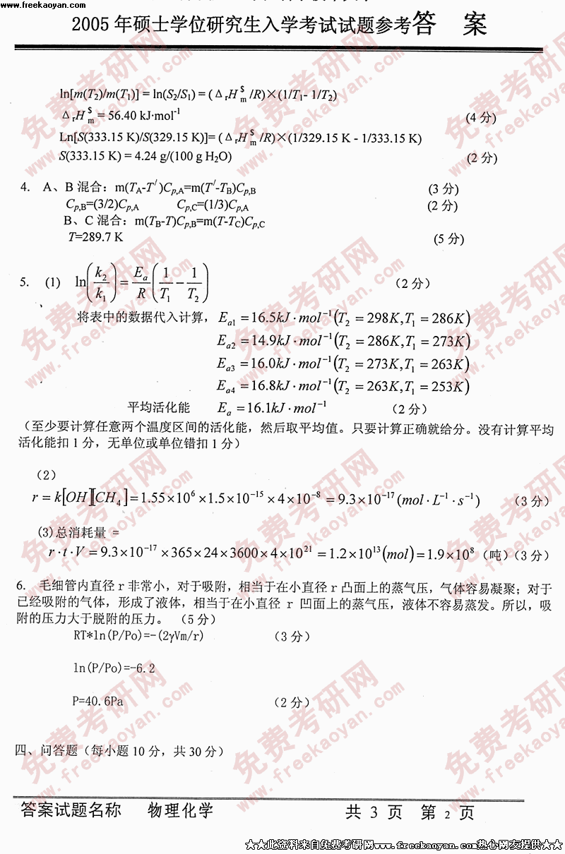 中国科学技术大学2005年硕士研究生入学考试物理化学答案