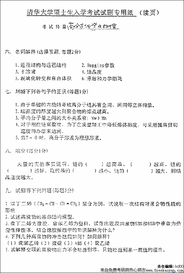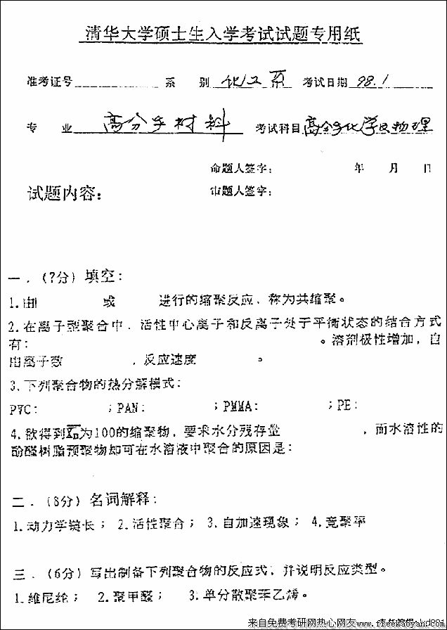 清华大学1998年硕士研究生入学考试高分子化学及物理