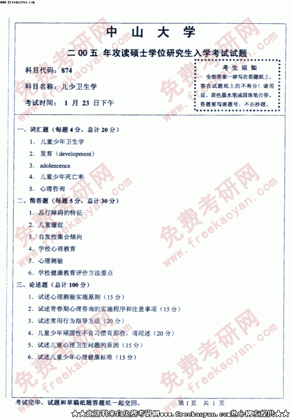 中山大学2005年硕士研究生入学考试儿少卫生学