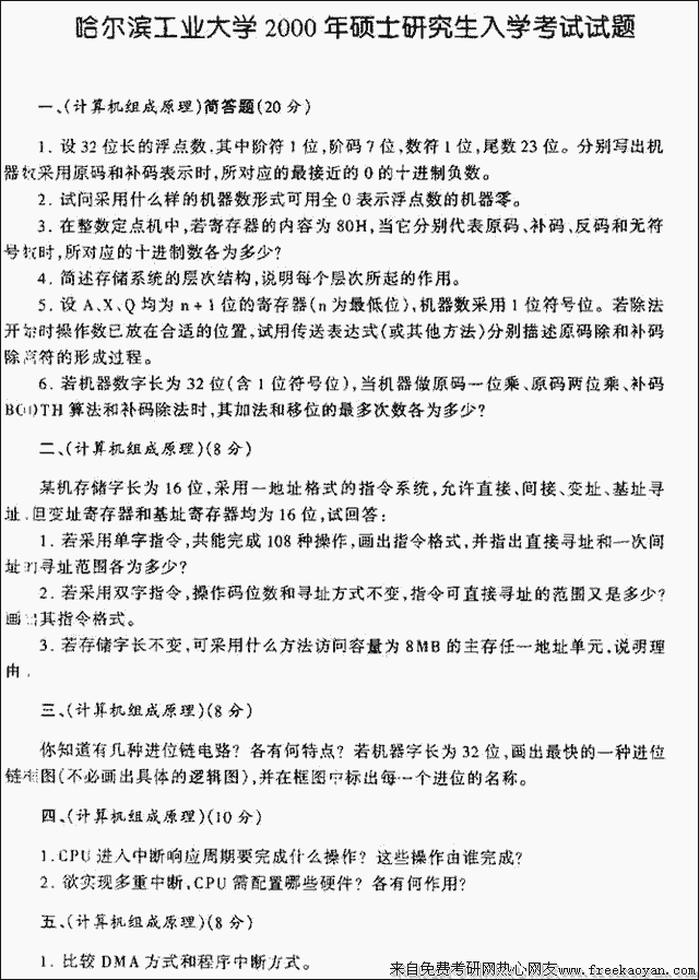 哈尔滨工业大学2000年硕士研究生入学考试计算机组成原理