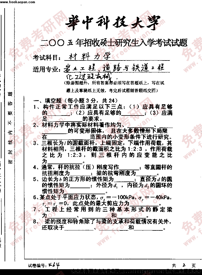 华中科技大学2005年硕士研究生入学考试材料力学(岩土工程、道路与铁道工程)