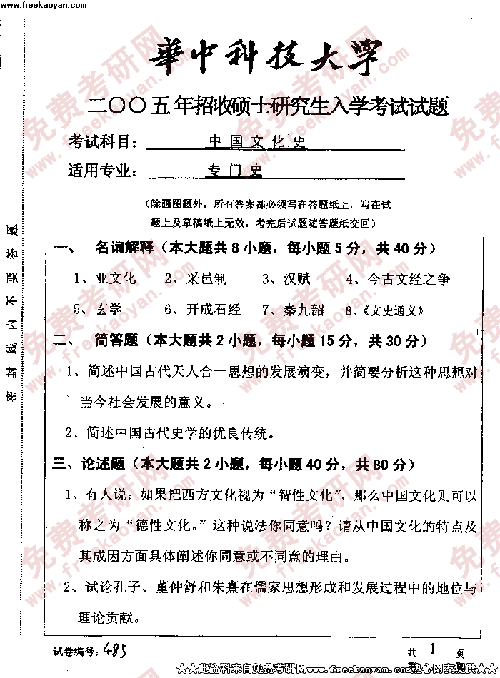 华中科技大学2005年硕士研究生入学考试中国文化史