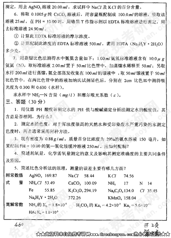 华中科技大学2002年硕士研究生入学考试水质分析化学