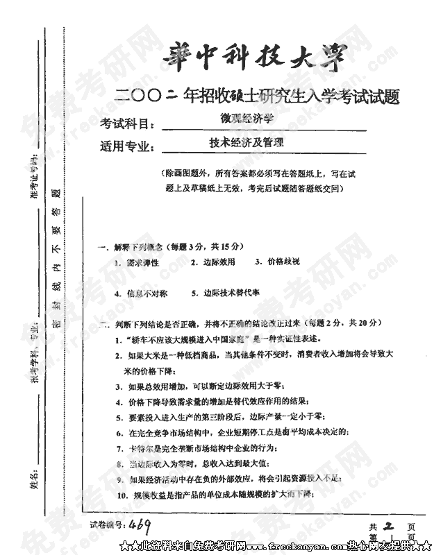 华中科技大学2002年硕士研究生入学考试微观经济学