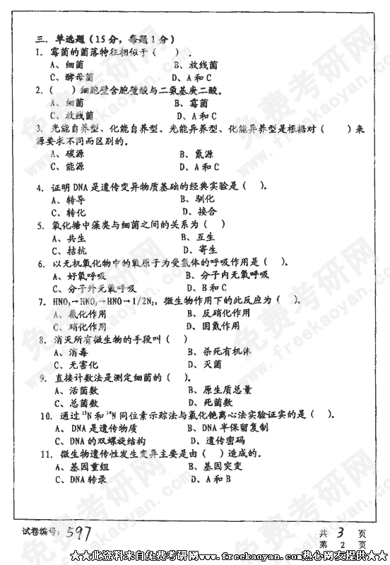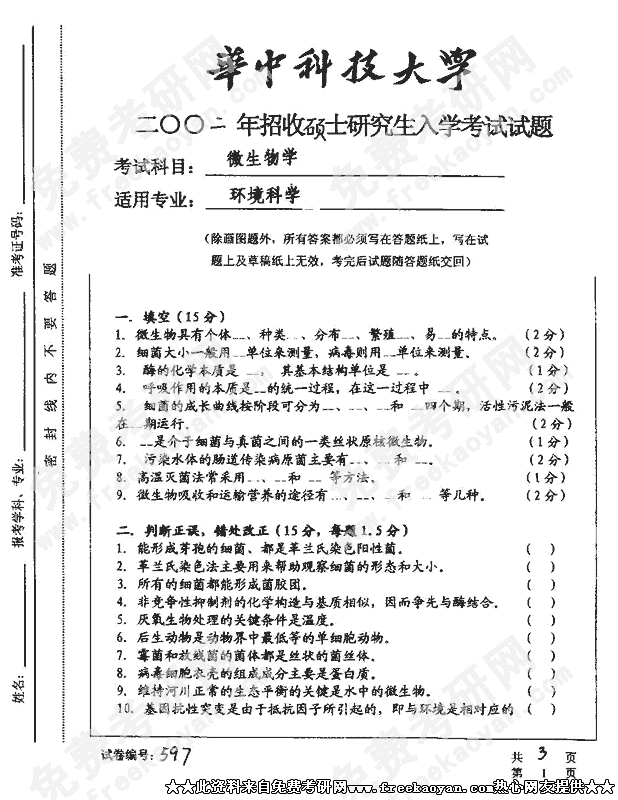 华中科技大学2002年硕士研究生入学考试微生物学B
