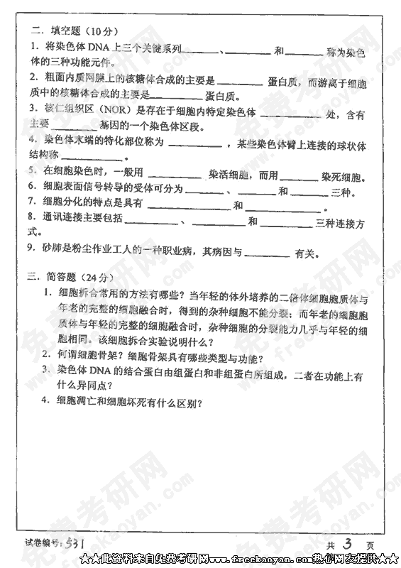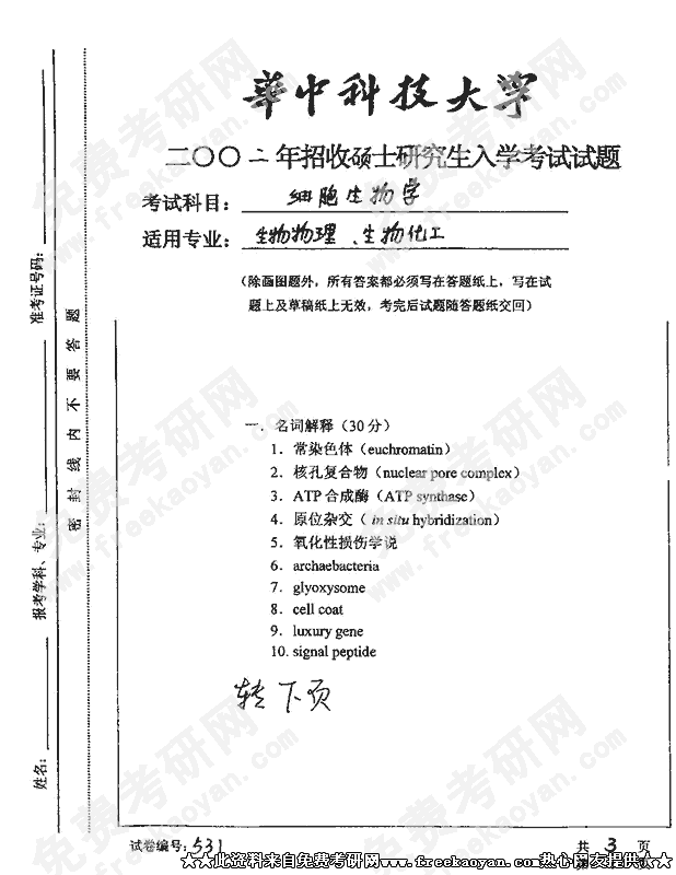 华中科技大学2002年硕士研究生入学考试细胞生物学