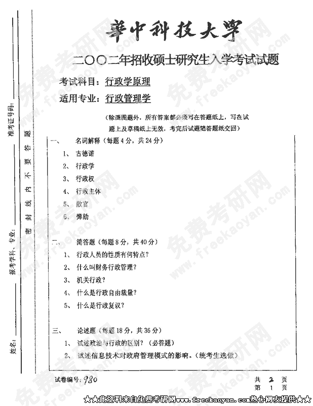 华中科技大学2002年硕士研究生入学考试行政学原理