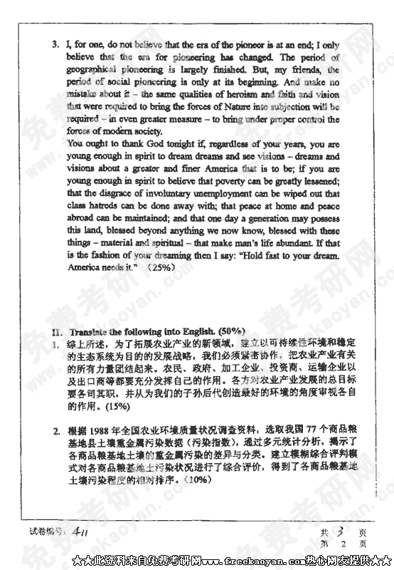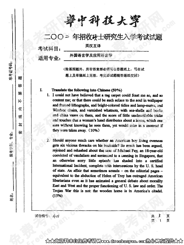华中科技大学2002年硕士研究生入学考试英汉互译