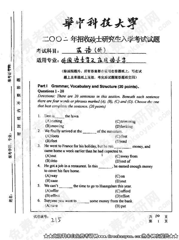 华中科技大学2002年硕士研究生入学考试英语(外)