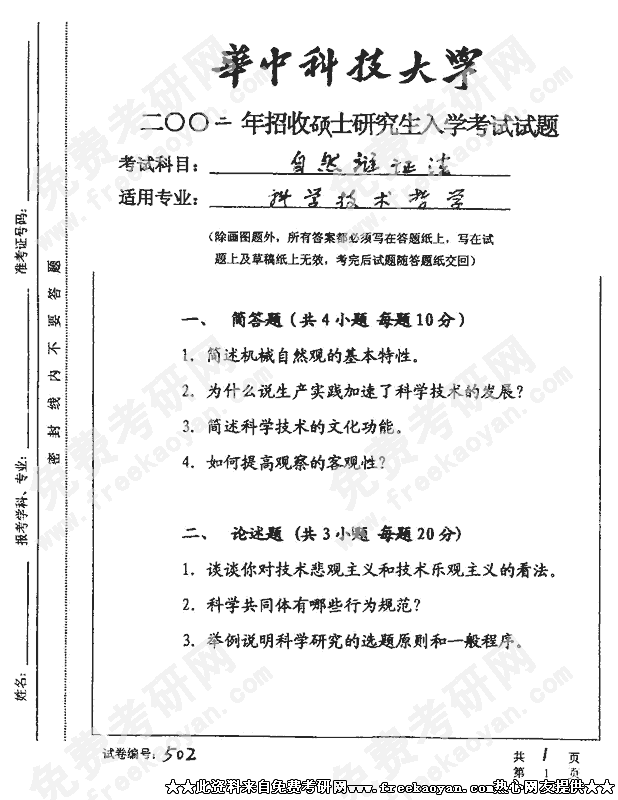 华中科技大学2002年硕士研究生入学考试自然辩证法
