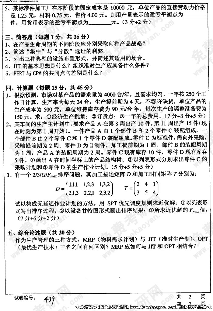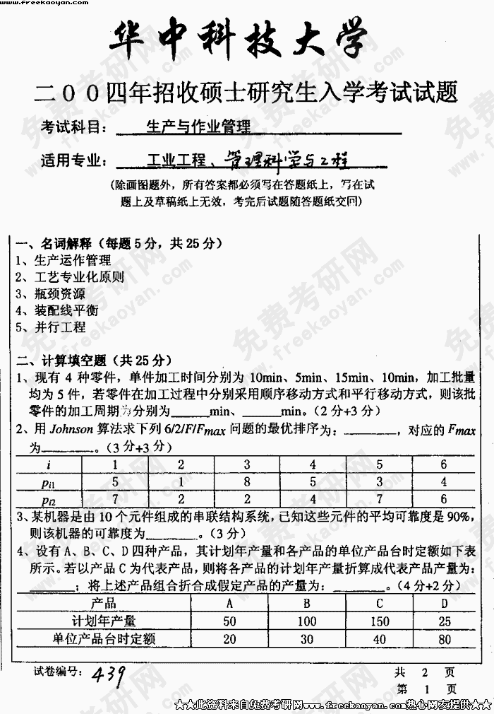 华中科技大学2004年硕士研究生入学考试生产与作业管理试题