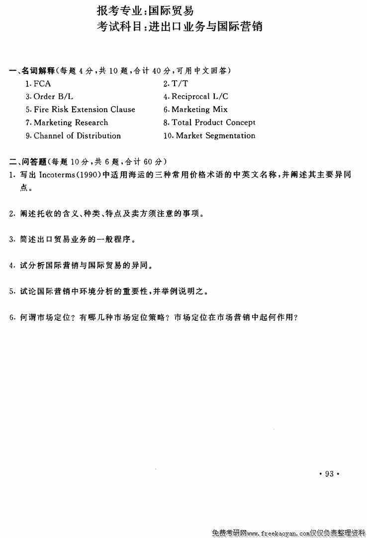 上海财经大学1995年硕士研究生入学考试进出口业务与国际营销
