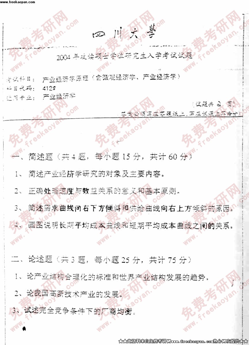 四川大学2004年硕士研究生入学考试产业经济学原理(微观、宏观)试题