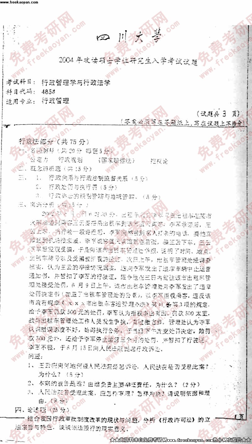 四川大学2004年硕士研究生入学考试行政管理学与行政法学试题
