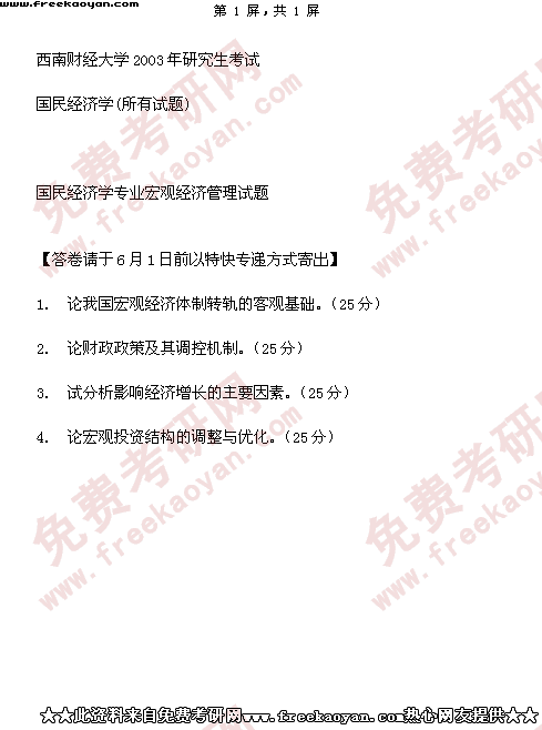 西南财经大学2003年硕士研究生入学考试国民经济学(所有试题)