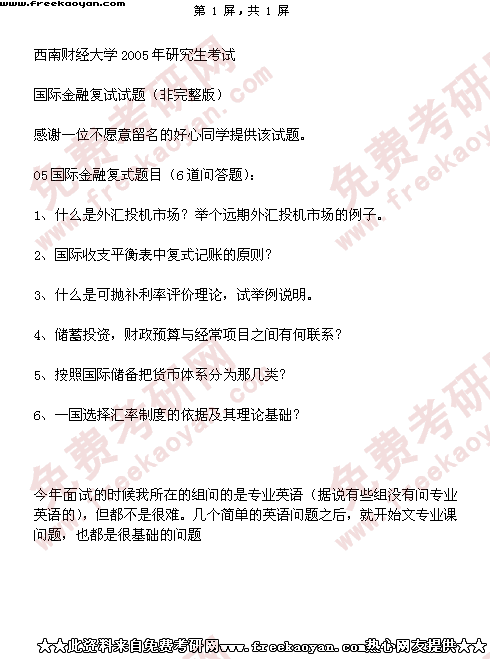 西南财经大学2005年硕士研究生入学考试国际金融复试试题(非完整版)