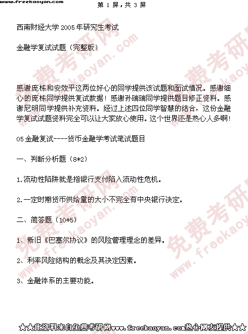 西南财经大学2005年硕士研究生入学考试金融学复试试题(完整版)