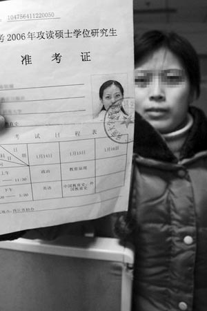 1月18日下午,陈小红再次来到商丘市招生办讨说法时,该招生办工作人员没有丝毫解释,一名工作人员只是随手递给了她一张《硕士研究生入学考试违规处理决定书》,上面写着因2006年1月15日上午参加全国硕士研究生入学考试违规,作出了本次各科考试成绩无效的决定。“在我报考点留存的《硕士研究生入学考试初试违纪考生处理决定书》上违规应试科目,居然是15日下午所考《中国教育史》,违规证据为小抄,我实在是不明白!”