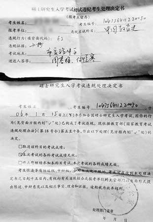 昨日下午,记者从陈小红所持《硕士研究生入学考试违规处理处理决定书》上看到的裁决内容为:考生姓名陈小红,考生编号104756411220050,于2006年1月15日上午,参加全国硕士研究生入学考试,因你的行为(即61条:携带与考试内容相关的文字材料;62条:抄袭或者协助他人抄袭试题答案或者带有与考试内容相关资料的)已构成了考试违规。现依据教育部《国家教育考试违规处理办法》作出本次考试各科考试成绩无效的裁决。而在报考点留存的《硕士研究生入学考试初试违纪考生处理决定书》上显示违规科目却为《教育学史》;据记者了解,1月15日上午陈小红所在考场的考试科目则是《教育原理》。