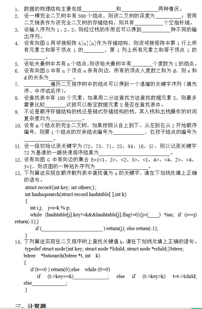 计算机考研数据结构试卷三(练习题含答案)(2)