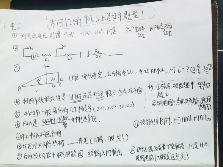 电工电子学(按理这是机电的,但今年就是考了,而且一考就是3~4个选择,占比很大了,来年不知情况如何,但还是看看吧),控制工程,理论力学,材料力学,单片机,互换性,机械原理,机械设计(笔试没题目,但针对面试还是扫一扫),制造工艺学,测试技术,数控机床,工程材料,工程制图。