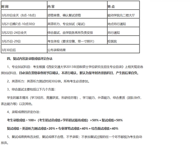 我是2019级西安交通大学能源与动力工程学院研究生,一级学科动力工程及工程热物理;二级学科为热流科学与工程。在这里和大家浅谈一下我的复试经历及经验,希望可以对大家这一时间段的准备有所帮助。 先说说出成绩前的一些工作。在经历了漫长的等待之后,西安交通大学于2019/02/15发布考研初试成绩。从18年年底到出成绩一共有80多天。而我自己在考研初试结束的那段时间没有进行任何学习,也就是在学校的那段时间一直没有学习。放假期间慢慢开始准备,用的学堂的能动考研资料,还可以,帮我绕过了很多弯路。然后对于自己简历的准备工作以及一些相关资料,简历的重要性不言而喻,在你联系导师或者是复试的时候,一份优秀的简历可以让老师尽快发现你身上的闪光点;然后还有一些相关资料,这些资料包括:简历中提到的自己的初试成绩打印单、简历中提到的获奖证书PDF以及自己的职业生涯测评报告,当然如果本科成绩比较优秀的话也可以把自己的本科成绩单加进去,我本科成绩不算特别好所以没有加。然后是意向导师的筛选,大家在初试结束后一定已经对自己的成绩有了大概的估计,根据自己的成绩范围,选出来自己比较喜欢的或者是理想条件下能够达到的导师,以及最差条件下保底的老师,建议不要多,一共三四个就足够,访问一下这些老师的主页并对其联系方式加以收藏,以方便第一时间沟通联系。最后就是对于面试和笔试的一个准备工作,这方面我做的不多,假期内只是学习了一下英语和流体力学这个课程,对于传热学和工程热力学都没有看太长时间,但是也都看了一定的时间,保证对知识的熟悉感。然后回头去看这段时间,我还是建议大家有时间有能力就多学学,多看看总是好的,因为我在复试笔试后就一直担心自己笔试表现不好。 出成绩后呢,我做的第一件事情是联系导师。凌晨拿到成绩单(注意当天的网站一定会崩溃,当时是等到了两三点才查到,一定要有耐心)后我马上完善给老师的邮件,对了联系导师的邮件不一定要成绩出来再写,可以提前写好然后当天完善就可。联系导师这件事,我觉得还是有必要的。为了防止自己的邮件内容有问题,找了家长和几个关系很好的同学(注意这些同学尽量不要和你考同一所学校的同一专业)一起审阅邮件,大概修改了七八次确保一定没有问题之后(包括没有格式问题,这是最基础的),在早晨的九点给老师发送了过去,选这个时间点是考虑到凌晨发送不太礼貌,然后发送太晚又可能被其他人先行一步,所以选了这个点。收到老师肯定的回复后就着手准备复试的笔试和面试。 然后是复试当天,三月中旬,距离初试成绩发布过了一个月,一个月就是大家好好学习好好准备的时间。复试流程的表在下面,这个表是我直接从公告中复制粘贴过来的,基本流程就是这些,每年都不会变化。每年都有一个同学们自发的考研交流群,799348532,初试成绩出来之后同学们可以在这个群里看一下自己的排名~ 复试之后,我们所有能做的工作就都做的差不多了,我是在复试结束后给自己联系的导师又发了一封邮件以询问情况。基本在复试结束后的第二天晚上,导师通知我已经被拟录取,根据学院安排等通知就可以了。以上就是我去年的一些复试经历和过程。关于复试的一些具体准备方法及建议,学长还在总结以尽可能做到万无一失,到时候在复试课程中再和大家聊聊。最后,祝大家新年快乐,一战成硕! 2020/02/04于家中