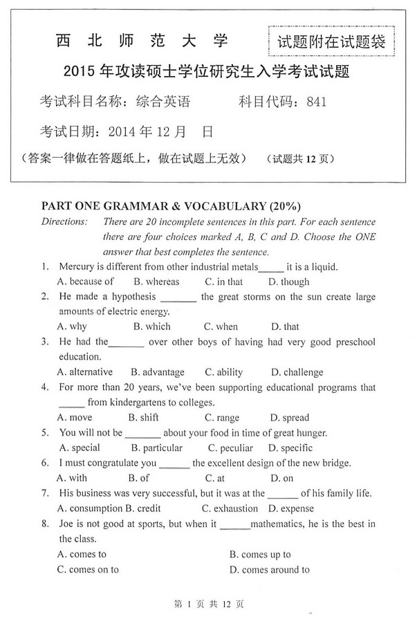 2015年西北师范大学841综合英语考研初试真题(3)