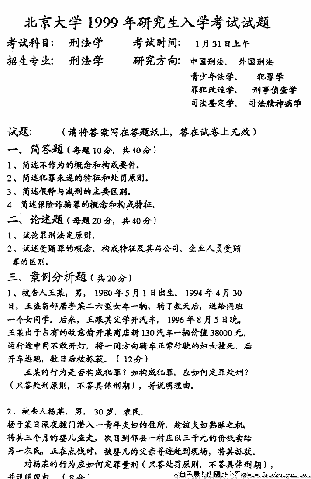 专业课考研经验 本站小编 FreeKaoyan 2018-01-22一、 填空题(每题1分,共10分)1.夏朝的中央直辖监狱,称 。2.商朝将人捣成肉酱的酷刑,称 。3.西汉初期强制实行早婚。汉惠帝的诏令规定,女子年 岁以上至三十岁不嫁,罚交五倍的人口税。4.晋朝规定,买卖物品即使未立文券,也须按成交值征税百分之四,此称 。5.蒙古族在成吉思汗时期已制定出简单的成文 ...