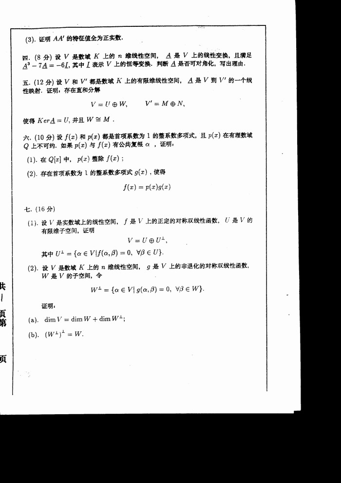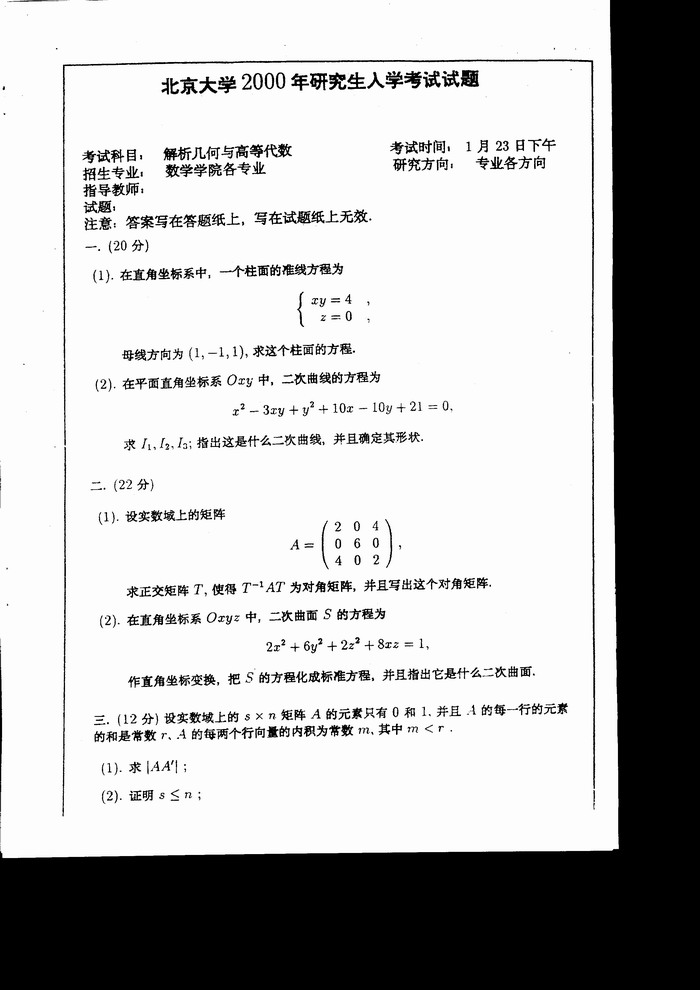 专业课考研经验 本站小编 FreeKaoyan 2018-01-22北京大学2001年考研真题-解析几何高等代数