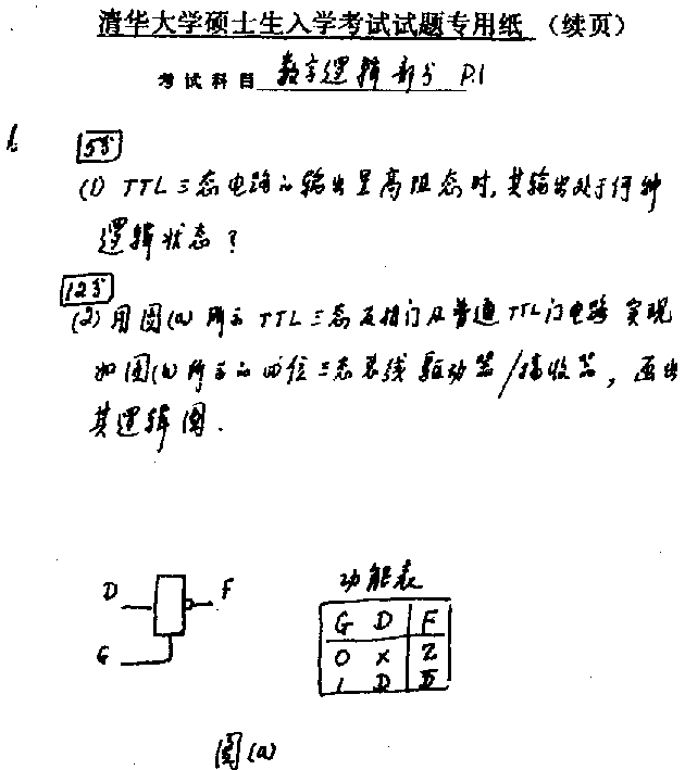 专业课考研经验 本站小编 FreeKaoyan 2018-01-22数字逻辑部分(50分)1(10分)图1所示总线上接有8个TTL型驱动器和16个TTL型接收器。驱动器和接收器的功能表如图2所示,它们的主要有关直流参数为:正常态下“1”输出电流IOH>=6mA高阻态下输出漏电流IOZ<=20uA正常态下“0”输出电流IOL>=24mA数据端“1”输入电流IIL<=1 ...