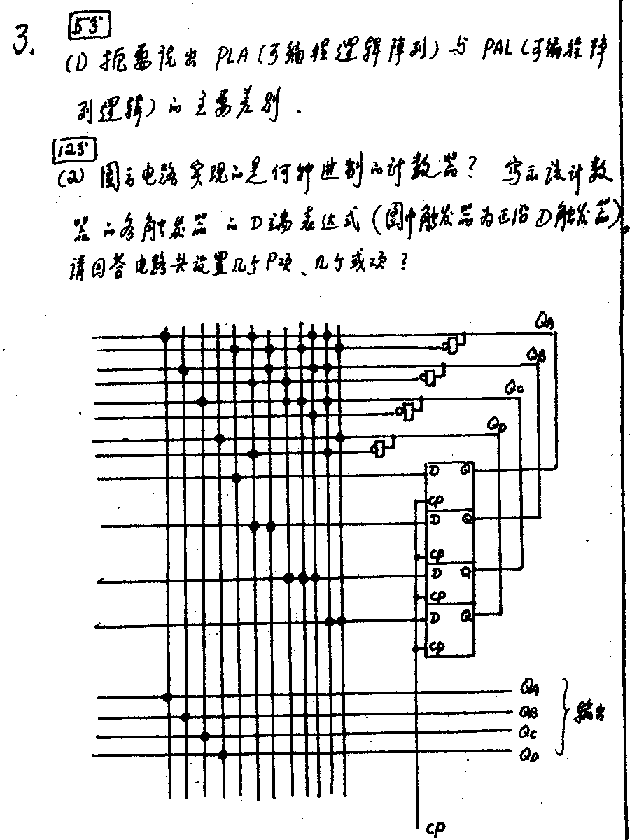 专业课考研经验 本站小编 FreeKaoyan 2018-01-22数字逻辑部分(50分)1 (①占20分,占5分)① 用图6.15所示可编程序阵列逻辑电路(Programmable Array Logic,简称PAL)实现7进制加计数器。在阵列中,纵、横线交叉处漆黑小圆表示纵、横线连通。图中触发器为正沿触发的D型触发器。② 试说明为什么上述逻辑电路是一个PAL电路 ...