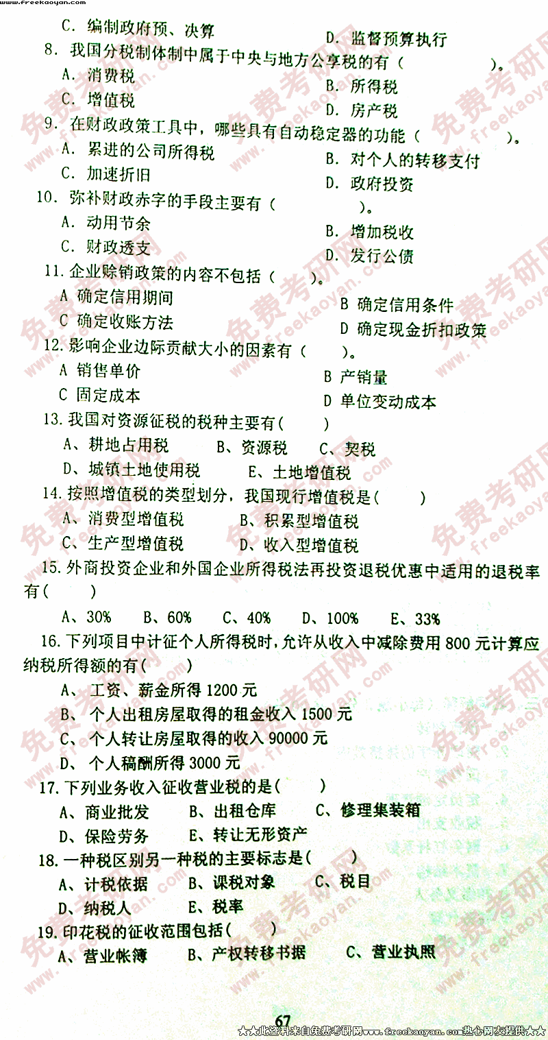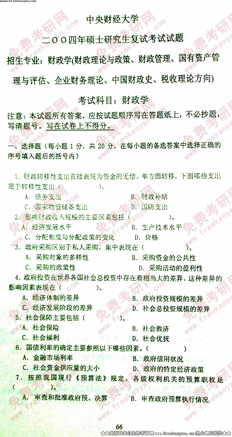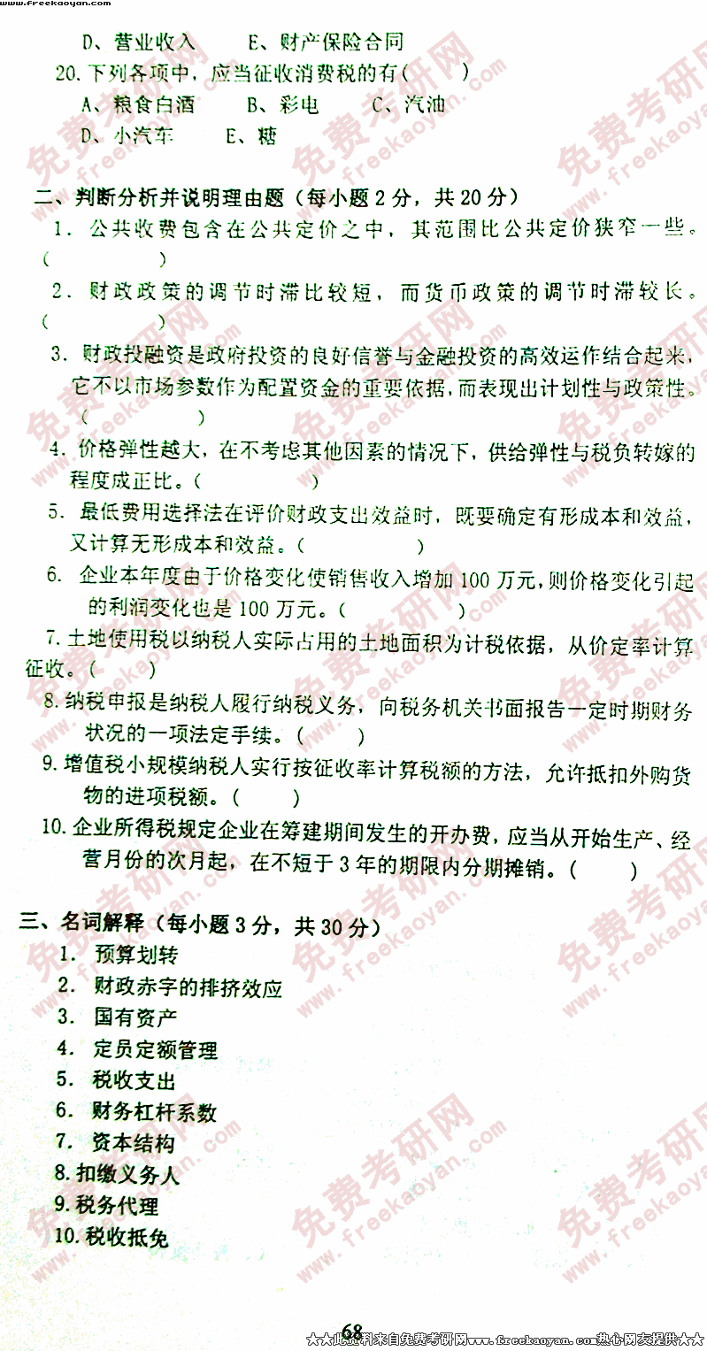 招生专业:财政学(含税收)考试科目:财政学注意;本试题所有答案,包括判断和填空,应按试题顺序号写在答题纸上,不必抄题。写在试题纸上不得分。 一、填空题(每空1分,共15分)1.政府间事权划分、政府间①()划分和政府间②()构成了政府间财政关系的主要内容。在政府间事权划分方面,宏观经济稳定方面的事 ...