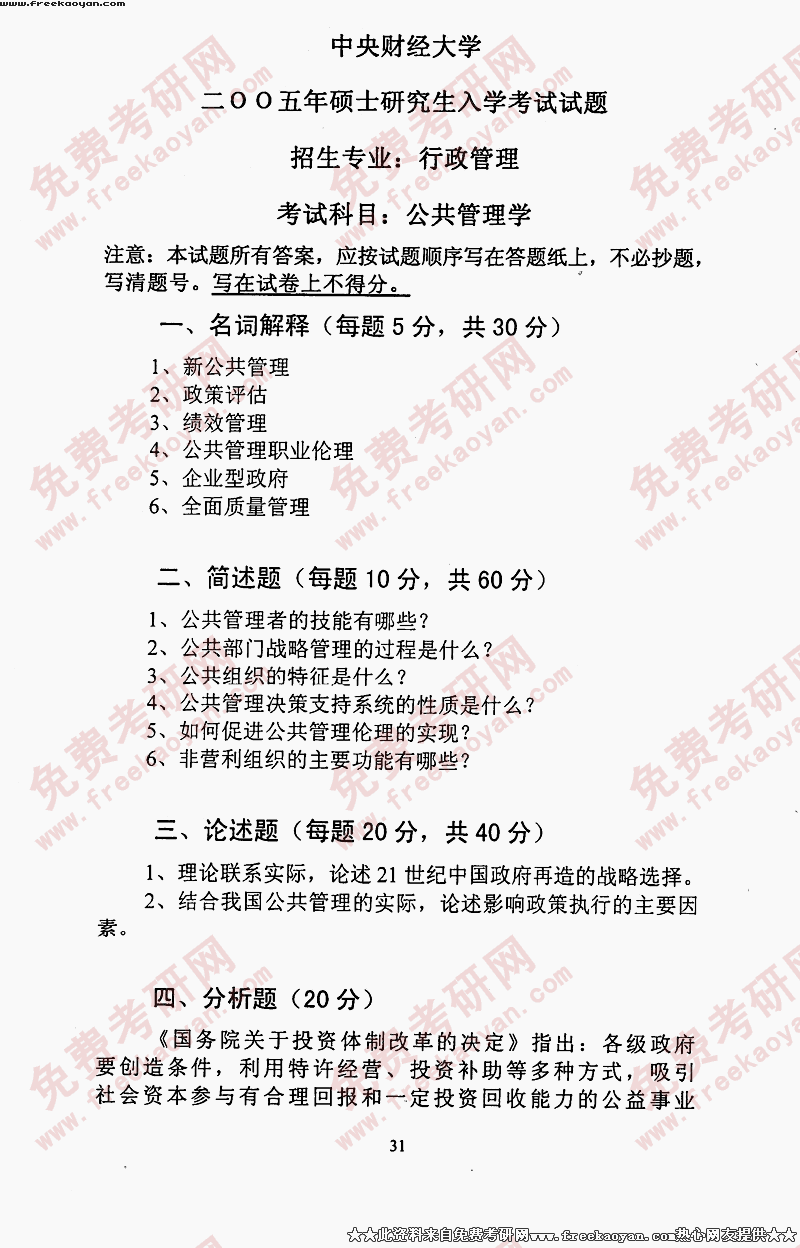 中央财经大学2005年考研真题-行政管理学