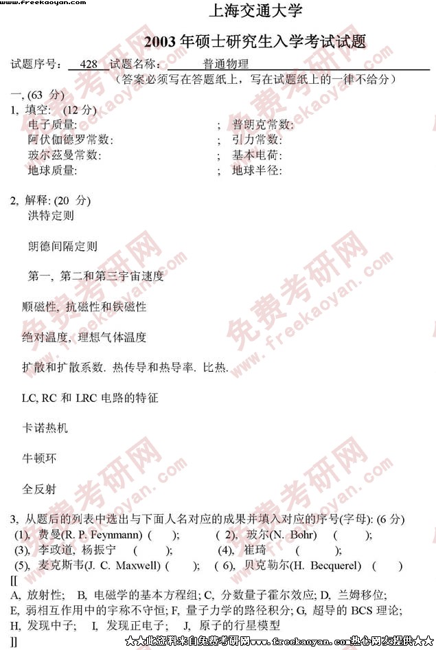 专业课考研经验 本站小编 FreeKaoyan 2018-01-22上海交大科学史系2000年硕士研究生复试试题一:科学常识(多项选择,每题2分,共30分) (注:正确陈述的可能是1~4个。无论出现错选或漏选,该题得分即为零) 1、在相对论理论体系中,“光速不变原理”是一个: A:实验结果 B:理论推导的结果 C:假定 D:并未得到实验的证实 2、在以 ...