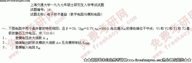 专业课考研经验 本站小编 FreeKaoyan 2018-01-22上海交通大学2001年考研真题-电子电路电子电路(模拟电子技术与数字电子技术)