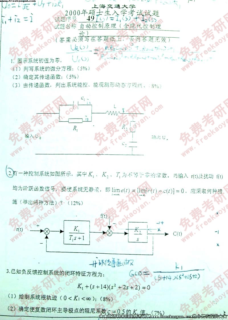 上海交通大学2000年考研真题-自动控制原理