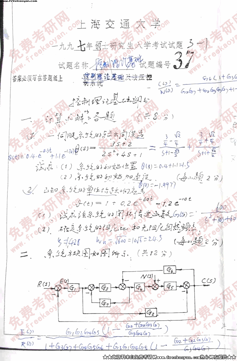 上海交通大学1997年考研真题-自动控制原理