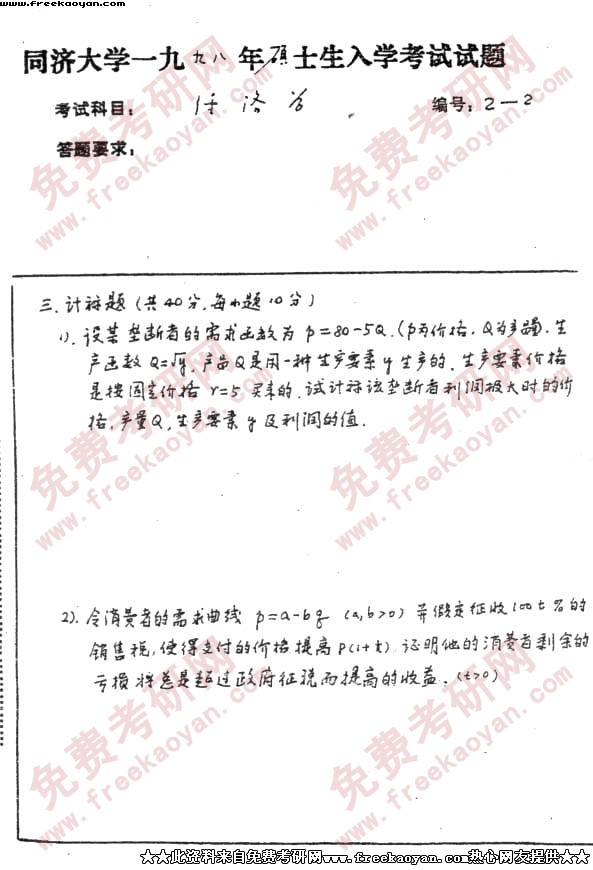 专业课考研经验 本站小编 FreeKaoyan 2018-01-22同济大学城市道路交通与基础设施规划试题2004年一 、填空(40分)1. 城市铁路客运站应布置在______________,编组站应布置在______________。2. 某条公交线路长 公交车运营速度为 ,配置公交车 则其发车频率为______________。3. 反向曲线间最小直线段长为设 ...