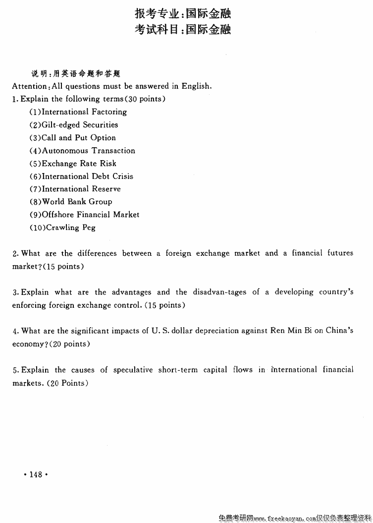 专业课考研经验 本站小编 FreeKaoyan 2018-01-22一,名词解释( 10*2 ): 1 、格雷欣法则 2 、费雪效应 3 、透支 4 、流动性 5 、有效汇率 6 、黄金的非货币化 7 、偿债率 8 、可转换债券 9 、无风险利率 10 、有效组合 二,论述题( 4*20 ): 1 、引起通货紧缩的原因是什么?通货紧缩对经济运行有何影响?应当 ...