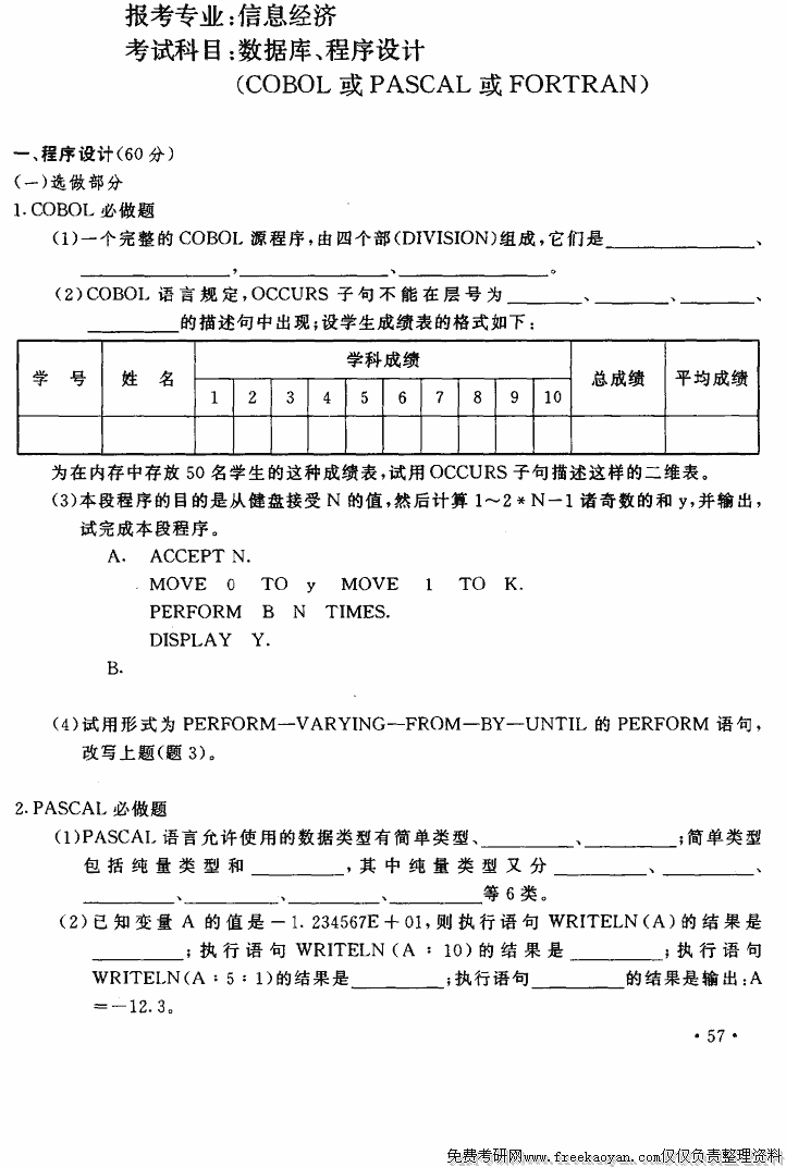 上海财经大学1994年考研真题-数据库、程序设计(COBoL或PASCAL或FORTRAN)