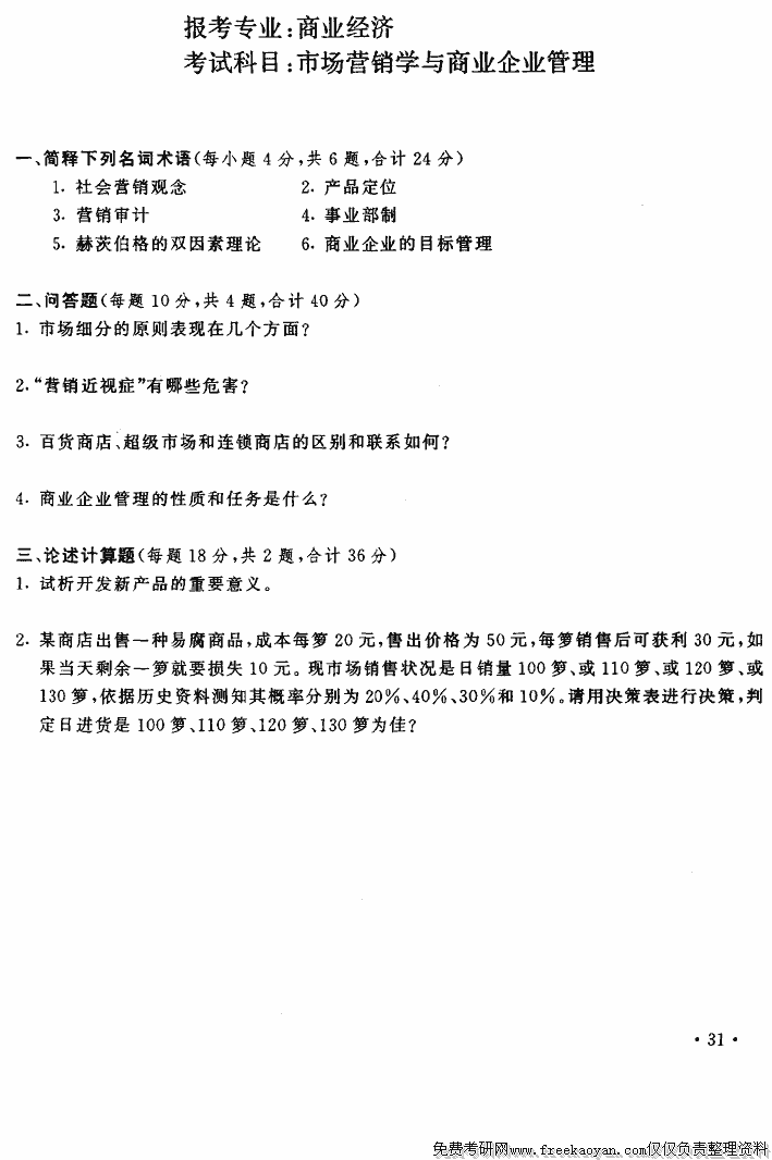 上海财经大学1994年考研真题-市场营销学与商业企业管理