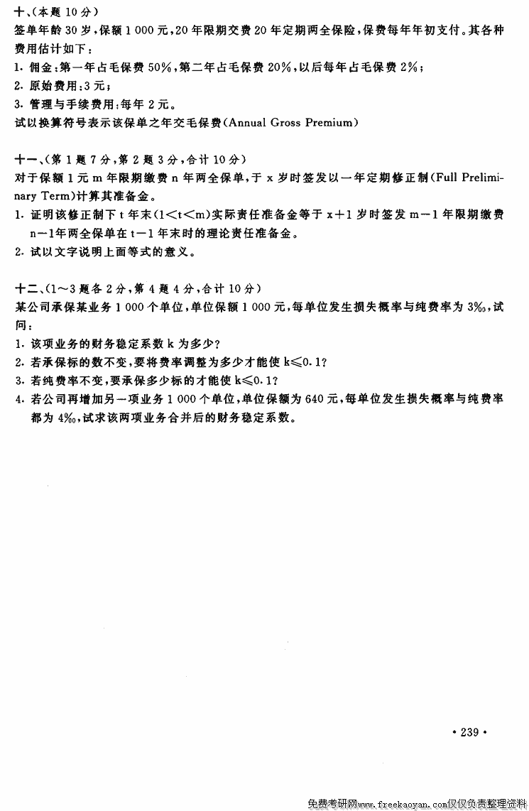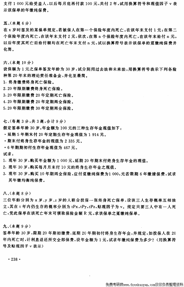 上海财经大学1997年考研真题-保险数学(费率与准备金计算)