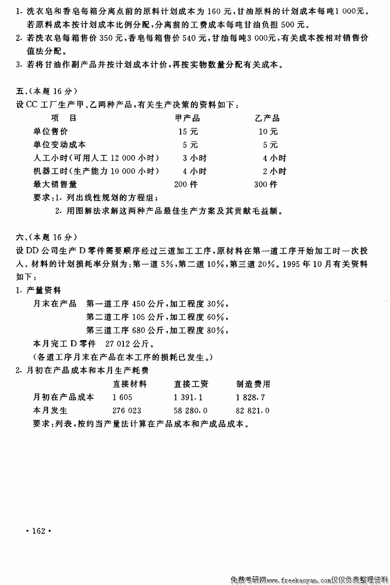 上海财经大学1996年考研真题-成本会计与管理会计