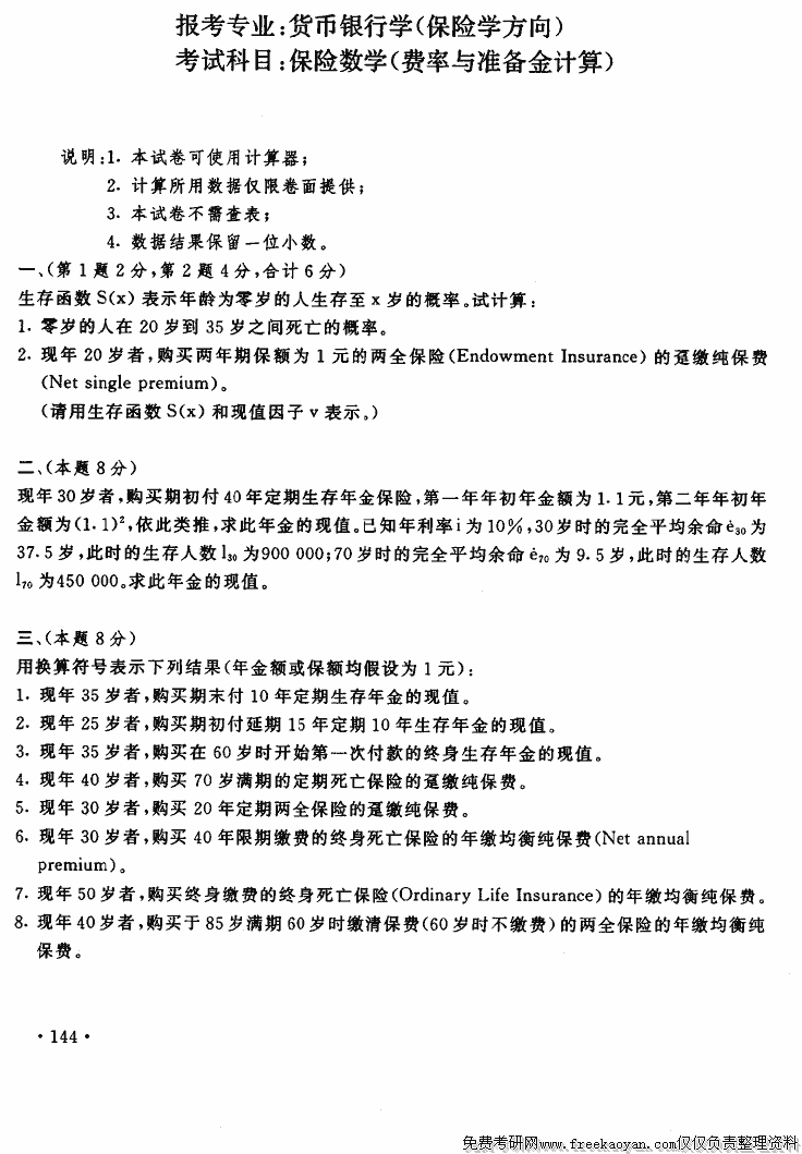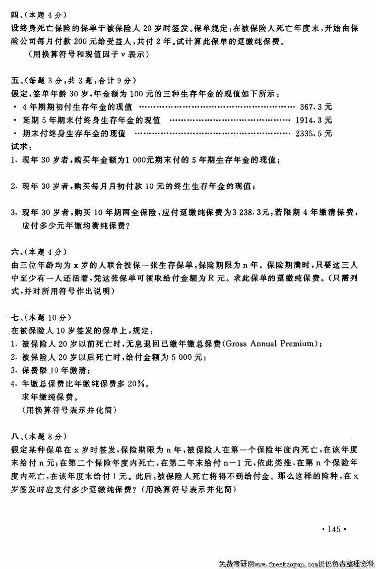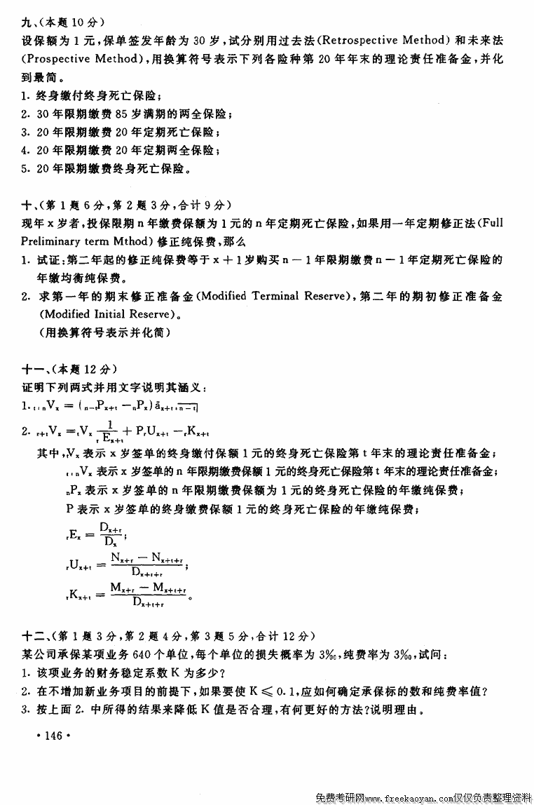 上海财经大学1996年考研真题-保险数学(费率与准备金计算)